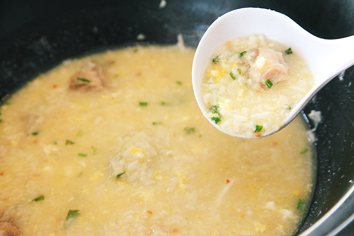 當一道又一道食材輪流上“蒸”後,炊蒸食材的過程當中所滲透出的“肉汁菜液”通過蒸盤的孔洞流到鍋底里去與米粒翻滾而熬煮出鮮味極度濃郁的米湯。在完成所有的蒸菜後,服務員就會掀起蒸盤,裡頭就是各類食材精華匯聚的湯粥,然後加入一顆雞蛋,香菜,醬油以及蒜頭油,那就呈現出一大碗的米湯粥,還有在早前加入的干貝更提升了一整鍋粥整體的口感。