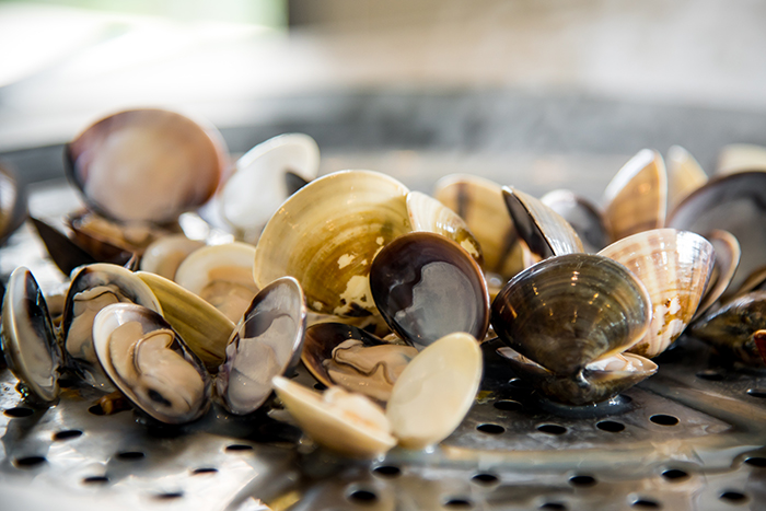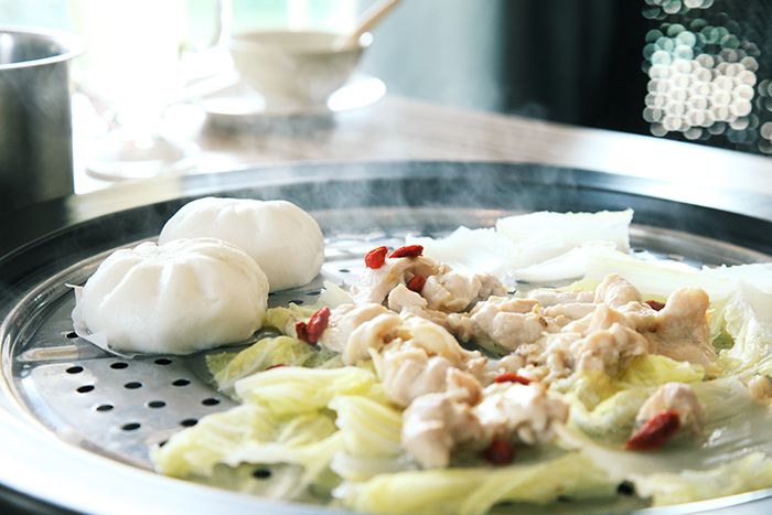 在還沒有開始“蒸”正鮮味大餐時,“蒸鮮閣”的服務員就會先在蒸汽鍋底倒入生米,裡頭混合了俗稱“江瑤柱”的干貝,然後再加入雞肉和雞骨,然後才正式開始炊蒸各式的食材。在雞肉的調味方面,蒸鮮閣自製了獨家以當歸醃製的肌肉塊,再搭配紀子放到蒸盤上以5分鐘的時間慢慢的把肉蒸熟,同時也把紀子和當歸的味道在蒸汽的壓迫下被逼進入到雞肉裡頭,掀開厚重的鍋蓋,除了蒸汽炊煙瀰漫,藥材的本味再加上雞香味也同時逼近到鼻孔前。隨後,陸續擺上蒸盤的就是一連串的海產,包括了魚,草蝦,蛤蜊等。海產類全部都沒有額外的加工,在蒸熟後自然呈現出那海產原始的本味。除了肉類,蒸鮮閣還有蒸香菇,蒸白菜,蒸西蘭花菜等無所不蒸,再配上館內獨制醬料那更是錦上添花,當中包括了芝麻醬,腐乳,辣椒,豆瓣醬等擺在桌上任君選擇。掀蓋後的“蒸”材“食”料一般上都不見議放慢速度來吃,這全因為蒸盤上的熱氣不斷湧上來,時間長了就會把蒸菜給炊幹了。