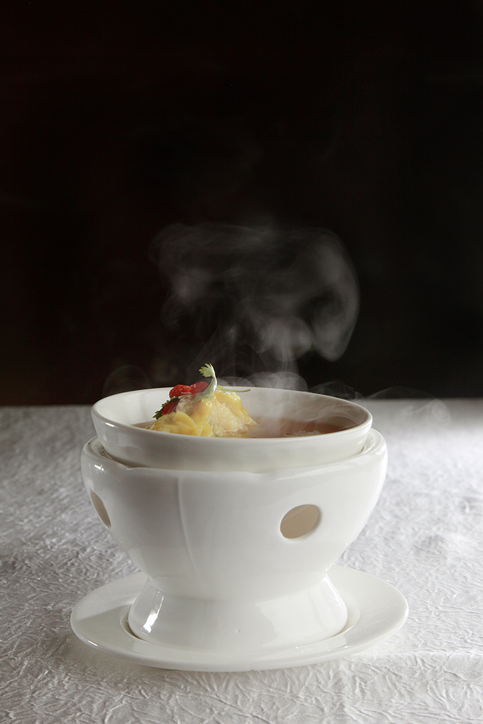 蒸燙其實並不是一個新的烹調名詞,只不過是平時我們沒有太過留意這一種料理。比起慢火熬湯,生火直接隔著煲將湯水煮沸,時間越長,湯水就會蒸發而變少也會變老,因此煮湯的材料精髓也就會慢慢的滲入到湯裡頭,也稱之為“老火湯”。老火湯裡的肉都不好吃,肉質乾燥,其味道都跑到湯裡,所以一般燉湯都只會選用肉骨去熬煮。而蒸湯是在沸水裡熬煮,隔開了與明火的直接接觸,煲內的湯水不但不會因長時間的熬煮而迅速的被蒸發,而且湯內的食材也不會變得老燥。天寶閣的水餃蒸雞湯可以將湯內的雞肉保持鮮嫩,湯頭依然存有濃郁的雞鮮味,再加上水餃本來就是蒸的天物,與蒸湯結合簡直就是完美的搭配。