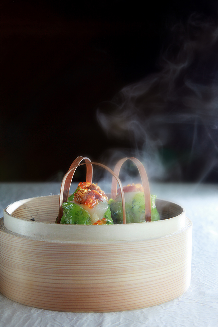 提到蒸水餃就想到點心。天寶閣的點心主廚也特別強調要蒸出好點心,萬萬不能選用冷凍食材。理由很簡單,冷凍的內陷溫度都會低過點心的外皮,如果要使到冷凍內陷被蒸熟而使用高溫或長時間蒸煮,那麼外皮就會給蒸得糊爛而脫落了。天寶閣創意點心料理當中包括了黑松露XO醬蝦餃,一口把點心咬了一半,另一半的外皮依然粘著內陷而不會分開。