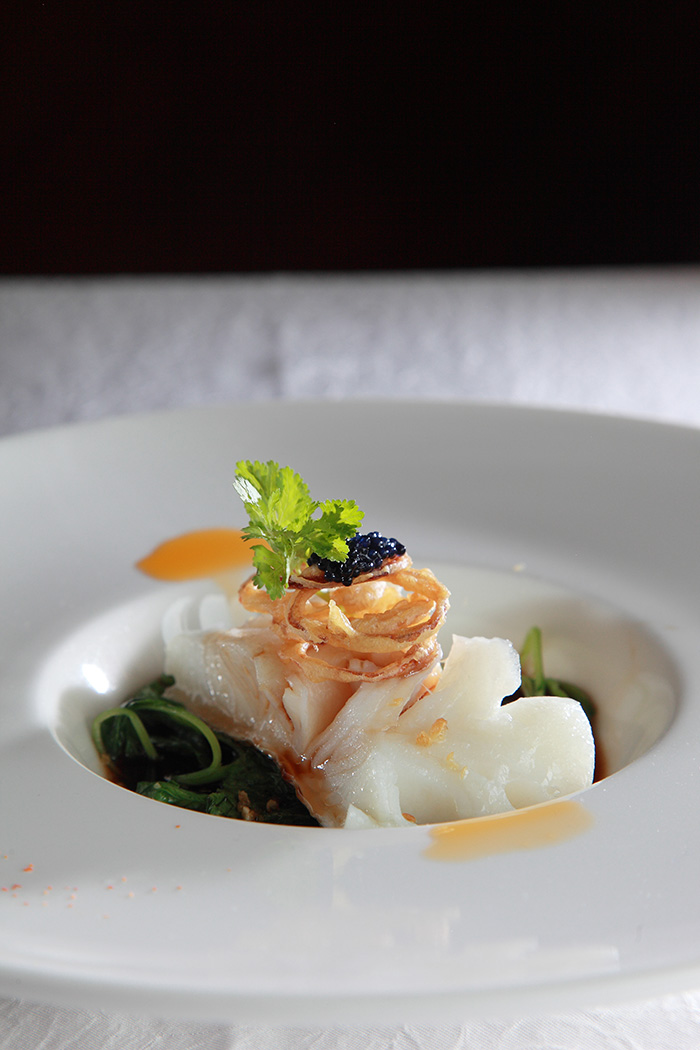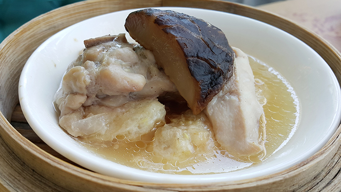 品嚐了天寶閣蒸菜之一的香辣金蒜莧菜苗蒸鱈魚,入口即化的魚肉也不會因為蒸而變得乾燥,由此可見廚師在拿捏蒸的過程中掌握了應有的火候及時間長短,不會使到海鮮的肉質變差。莧菜放在盤底下,這樣一來熱蒸汽往上升時,水蒸氣只圍繞在魚肉的範圍而不會使青菜過於熟透而變得泛黃。此外,熱蒸汽觸碰到魚肉變成了水再與特製的醬油及金蒜結合形成這盤獨特口味的一菜一魚佳餚。