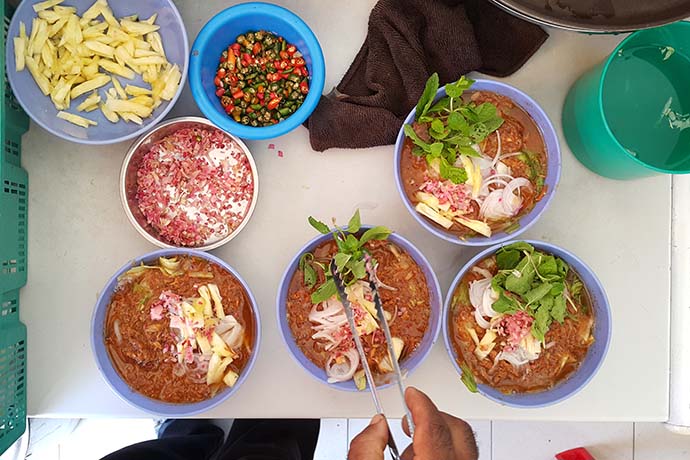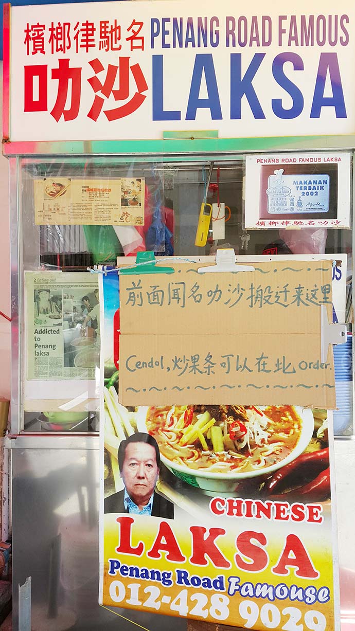 這是無意中發現到那鮮紅色的布條還有那簡單的兩行手寫字交代了原本的叻沙已搬遷,抱著希望走了進這家新店。站在門口,老闆立馬走向前解釋「這是正宗的檳榔律叻沙,我們從“路頭” 愉園餐室搬到來這裡,如果也有想吃Cendol 煎蕊或炒粿條,我們也可以幫你們“order”,你們先坐下,我們幫你走過去叫就可以了。」自從遊客多了以後,這條街也開始興旺了起來,從較早起只有一檔在賣的叻沙到近幾年多了幾家加入戰圍。據老闆說自從檳榔律潮州煎蕊連鎖店被新加坡集團收購以後就連他們在愉園餐室擺檔的亞參叻沙也接管,因此他們就被逼搬遷另尋店鋪謀生。
