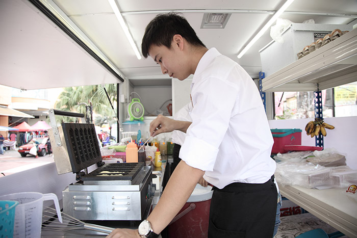 阮俊健和洪振雄是親戚,一樣都是為了興趣而離開了原有的工作崗位開始了實踐餐車的創業夢想。振雄道出了在一年前的計劃,「從開始什麼都沒有的我們,開始物色適合的餐車,也花上半年的時間找器材,自己開始研究食譜,自修自學,慢慢構思出這種創意的威化鬆餅,畢竟目前的市場還沒有出現這樣類似新樣的小吃。」