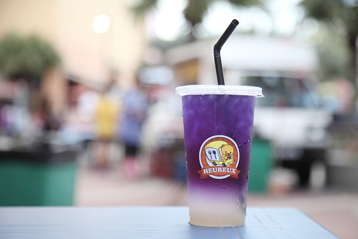 有了小吃就會搭配飲料,Heureux Food Truck也自創以蝶豆花自製成的蘇打飲料再搭配不一樣的果汁如草莓,荔枝,奇異果,芒果,柳丁,又或者是豆奶等。「我們每一天只烹煮一桶的蝶豆花,賣完為止。」 俊健和振雄兩人都堅持在每一天早上10點開始各自完成開當前要準備的食材,包括採購和製作新鮮的蝶豆花茶,兩人都非常熟悉工作上的操作程序,大家都可以在每一天準時中午12點半前開檔營業。