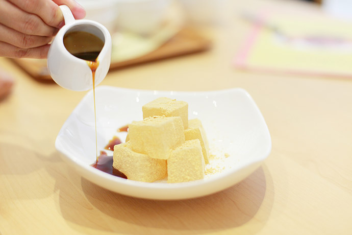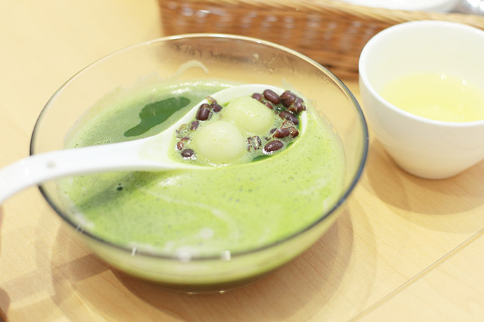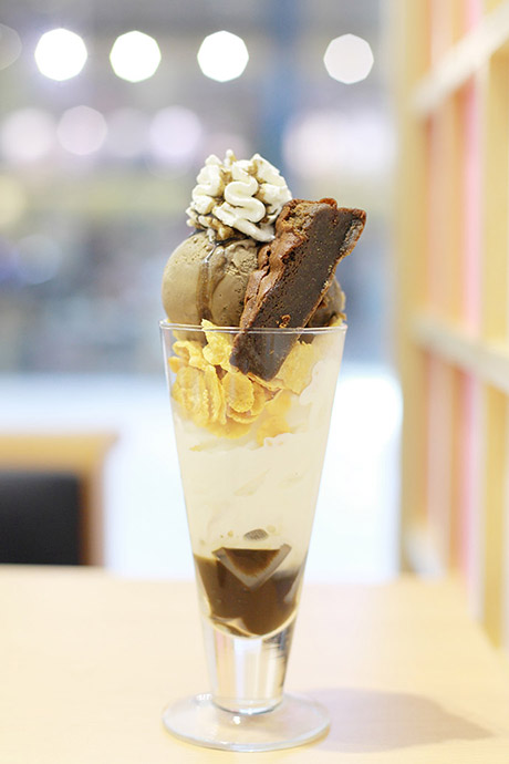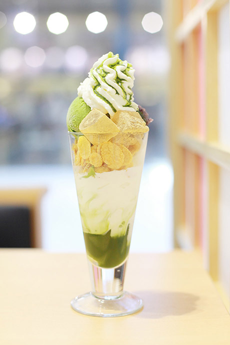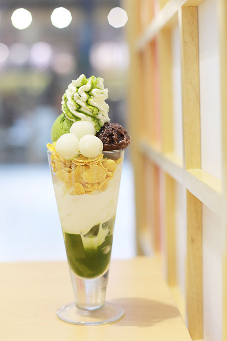 日本人最熟悉的甜點,也就是洋菜 (Kanten),俗稱“菜燕”,一種以海藻類植物中萃取出來的膠質製成的果凍甜點,就連許多日本和果子都大量使用了洋菜來做主要的材料。如今洋菜 (Kanten)不止單一食用,它也可以加入抹茶飲料一同食用,增加了多一分的口感享受。此外在日本人心中另一個傳統甜點不可或缺的就是蕨餅糕(warabi mochi),看似“麻糬”的甜點但並非是“麻糬”。蕨餅糕是以山蕨菜澱粉與糖製成的粉團, 再撒上一層的黃豆粉直接上桌食用,如今Kutami先生創意的將蕨餅糕放入高腳杯與軟雪糕搭配成“芭菲”(parfait) 設計出另一種西日結合的新式甜點。在芭菲裡除了有蕨餅糕,還加入了抹茶雪糕,玉米片,最後淋上糖漿 ,光看外型的設計就已經很開胃,更有趣的是讓食客在芭菲杯裡的一層層以湯匙挖掘出不一樣的驚喜口味。