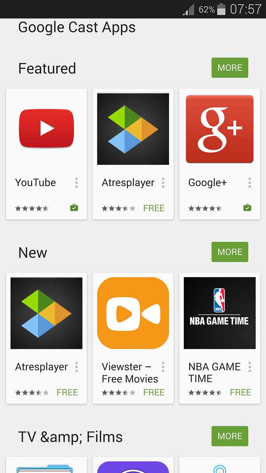 在手機或是平板電腦上所操作的應用程式在電視機投放HD高畫質影片和音樂。Chromecast所能支援的應用程式將視於地區而定,一般都能夠支援Youtube和Goggle +, 而在台灣地區可以支援中華影視和一些體育賽事。應用程式在電視機投放影片或播放線上音樂的同時,手機或平板電腦是可以分開獨立運作,如在手機查看電郵或上臉書的同時,電視機的播放都不會受到干擾。更多Chromecast能支援的應用程式可前往chromecast.com/apps 。 此外, 可以透過 Castscreen 功能將手機或平板電腦所顯示的畫面同時投放到電視的大螢幕上,包括欣賞手機裡所拍攝到的照片可以同時與家人朋友分享,又或者閱讀網路書籍等能夠享受更大的視屏效果。
