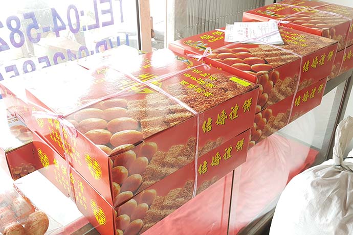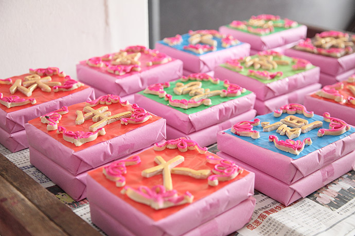 在這次訪談裡提到華人傳統餅時,我的目光就不定時會投射到那擺在角落而剛出爐的“酬神餅”,以粉紅色“麻將紙”包裹的糖餅,上面還附上以米粉麥芽糖片手工雕刻出的中文單字,再填上顏色,整體造型像是中國舊時代竹棚酬神宴上看到的海報設計。「這是“酬神餅”,傳統留傳下來,在祖父創業時期就有了,當時是有一位“頭手”懂得以這樣的方式刻字和做這種餅,現在只剩下我及一位住在高淵的老師傅依然還有在做這種的“酬神餅”。這是源自於中國潮州,也叫做“糖芳”,“芳”字取名源自方形,以花生糖為主,帶有花生香氣的意思。以前在中國清朝時期的酬神戲還有餅家會製作這類型的糖芳擺放在神壇上,酬神事後就分發給所有的大德以酬謝各方的慷慨捐獻,直到中國共產黨執政以後,酬神戲也就慢慢的銷聲匿跡。」 這一次的訪問安排也剛好碰上爪夷村裡的“保生大帝”千秋寶誕,也很慶幸能夠見識到這傳說中的傳統餅。