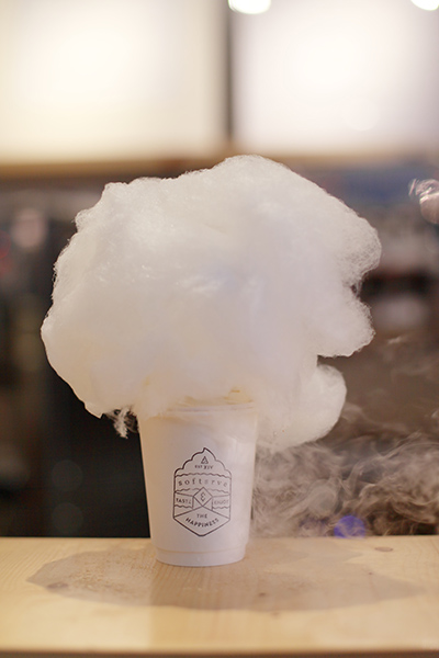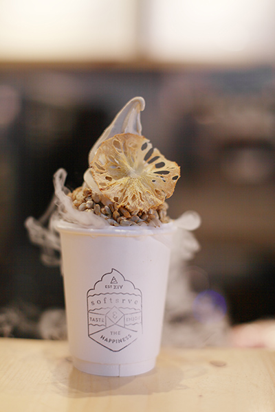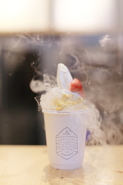 我認識Softsrve真的是透過身邊朋友不停在Instagram鋪天蓋地上傳那冒煙的雪糕而感到好奇,隨後友人的邀約下終於來到這家店一窺他的神秘面紗。的卻與其他一般的軟雪糕很不一樣,單靠從賣相來看就已經夠特別,軟雪糕以兩層杯子盛着,外層杯子放了乾冰,營造出冰冷的煙霧效果,二來乾冰還可以保持雪糕處於比較低的溫度,確保雪糕不會那麼快溶解。這特別的造型就已經很吸睛了,年輕顧客看到這麼特別的雪糕難免會發文上傳照片到一些的網絡社交媒體去炫耀分享。